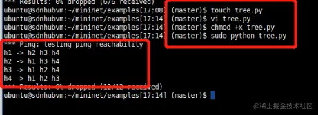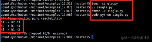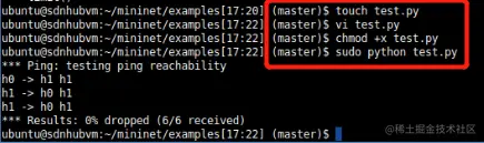 - 用 python 脚本创建与上述对应拓扑,创建完后的文件需要增加可执行权限chmod +x test.py,还是用sudo python test.py执行。