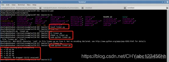 - 导入镜像后,默认处在/home/ubuntu的位置,可以使用pwd来查看当前的路径,动态调整。进入/home/ubuntu/mininet/examples文件夹,使用命令cd