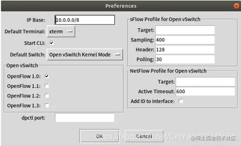 - “Edit”→“Preferences”,勾选 strat CLI(允许通过交互界面对拓扑结构进行调整),选择所支持 Openflow 协议版本。
