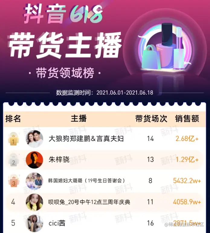 新抖监测了今年6月1日至6月18日抖音主播带货的数据,在美妆护肤品类上,第一名销售额2.68亿,第二名销售额1.29亿,但第三名销售额“断崖式”下降至5000万左右,到第五名,场次最多的情况下,销售额已经不到3000万。
