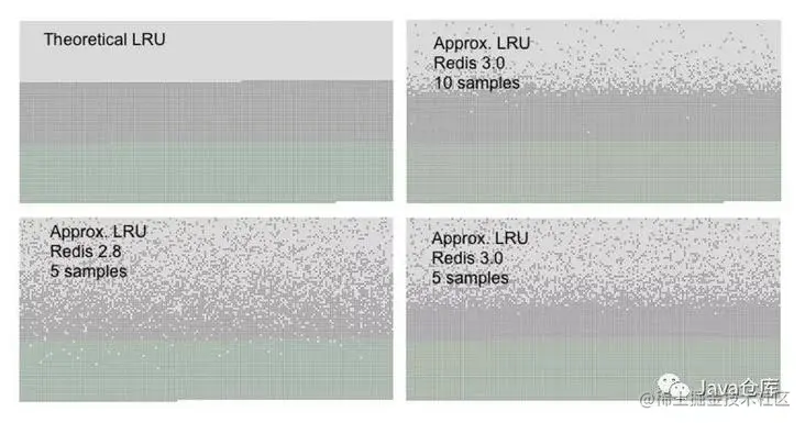 我们能看到Redis3.0采样数是10生成的图最接近于严格的LRU。而同样使用5个采样数,Redis3.0也要优于Redis2.8。