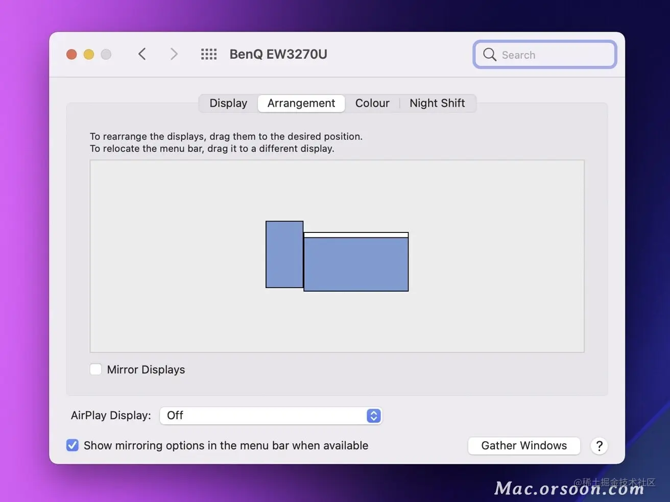 您还必须更改显示器在 macOS 桌面中的位置以匹配其物理位置。可以从相同的“显示”菜单中进行更改。