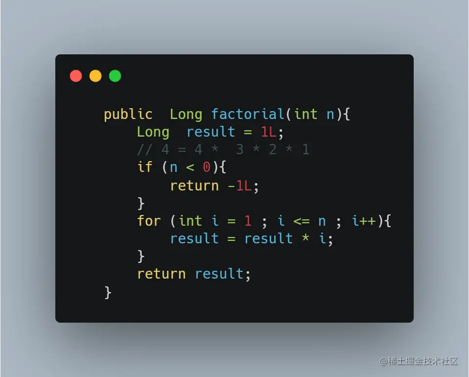 阶乘的公式为: n!=1×2×3×...×n,这是问题的普遍规律,算法的处理流程为从1开始,做一个for循环,设定一个变量来存储每一次累加的值。异常情况就是输入的n为负数,我们直接返回-1.