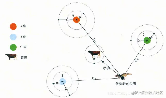 。GWO 的优化过程主要由每代种群中的最好三个解(即