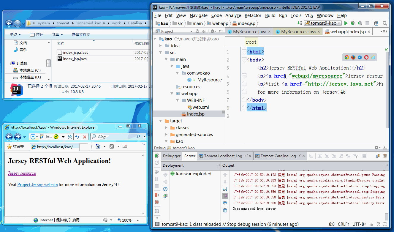 C:\Users\del-berlin.IntelliJIdea2017.1\system\tomcat\Unnamed_kao_4\work\Catalina\localhost\kao\org\apache\jsp ,jsp再第一次被访问时,会被编译成java 然后再被编译成class ,然后放到 tomcat的work目录下,但是IntelliJ 里,由于部署方式的原因 实际上是保存到了 上面的目录里,而实际的项目运行中是保存到了tomcat的work目录里: