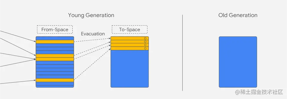 - 复制from-space的活动对象到to-space的一个连续的内存块里