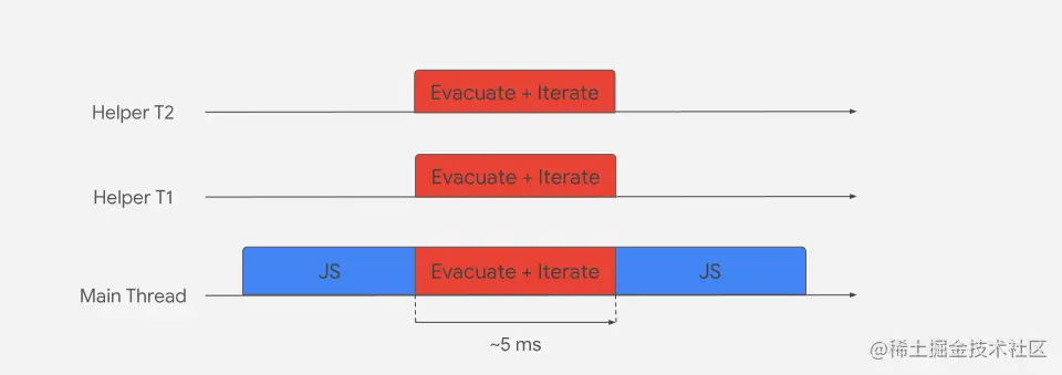 在新生代垃圾回收期间,V8使用并行清理将清理工作分发到多个辅助线程和主线程中。
