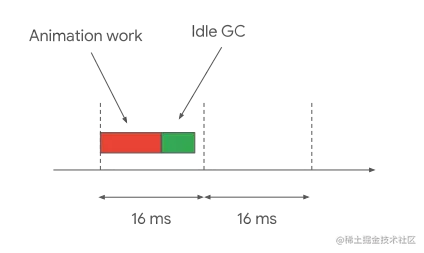 GC可以发布空闲任务(Idle Tasks),这些是最终会被触发的可选工作。Chrome之类的嵌入器可能有一些空闲时间的概念。比如:在Chrome中,以每秒60帧的速度,浏览器大约需要16.6毫秒来渲染动画的每一帧。如果动画提前完成,Chrome可以选择在下一帧之前的空闲时间内,运行GC创建一些空闲任务。