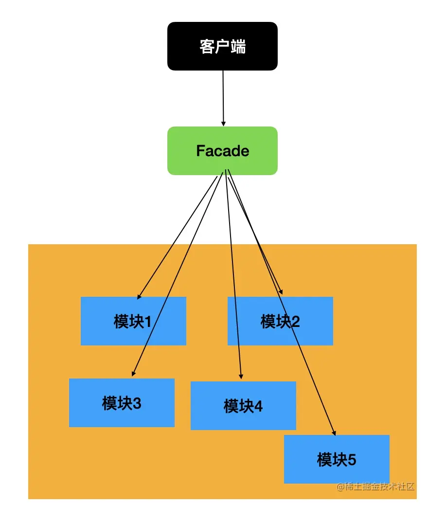 而用了门面模式之后,客户端不再需要了解具体每一个模块,只需要把自己的需求告诉 Facade,然后它去调用内部模块