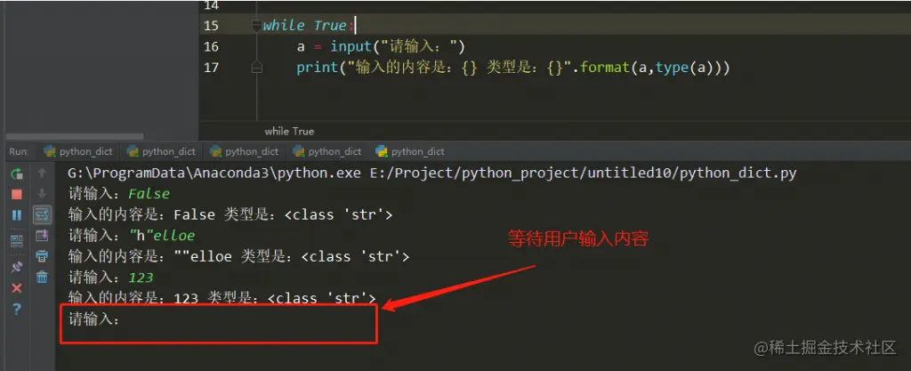 input 函数能接收用户输入的内容,并返回字符串 str 类型,示例代码如下: