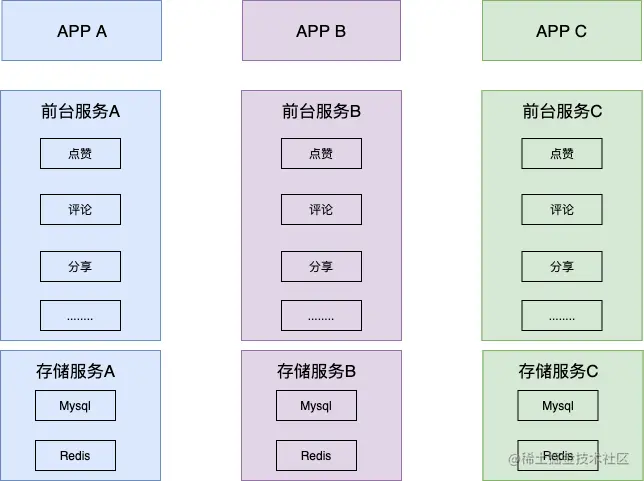 下面举个例子,来进行解释:比如我们的要开发一个APP 【X】,是一个偏社交类的产品,要做一个类似于朋友圈的功能,它就涉及到发布内容,评论,点赞,分享等功能。而公司有好几个产品,都有类似点赞,分享,评论的功能。而每个团队都是自己开发一套相同功能的服务。其架构如下: