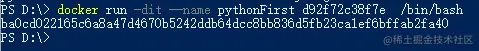 docker run -dit --name pythonFirst d92f72c38f7e /bin/bash