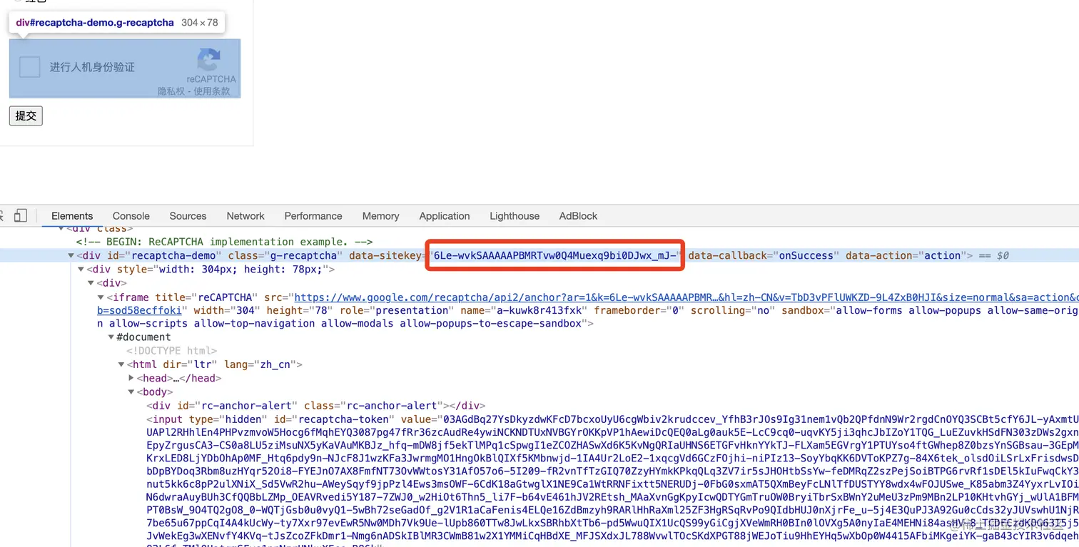 那 siteKey 怎么找呢?其实很简单,我们看下当前 ReCAPTCHA 的 HTML 源码,从源码里面找一下就好了: