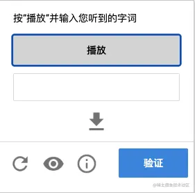 这时候我们如果能填写对验证码读的音频内容,同样可以通过验证。 这两种方式都可以通过验证,验证完成之后,我们才能完成表单的提交,比如完成登录、注册等操作。 这种验证码叫什么名字? 这个验证码就是 Google 的 ReCAPTCHA V2 验证码,它就属于行为验证码的一种,这些行为包括点选复选框、选择对应图片、语音听写等内容,只有将这些行为校验通过,此验证码才能通过验证。相比于一般的图形验证码来说,此种验证码交互体验更好、安全性会更高、破解难度更大。