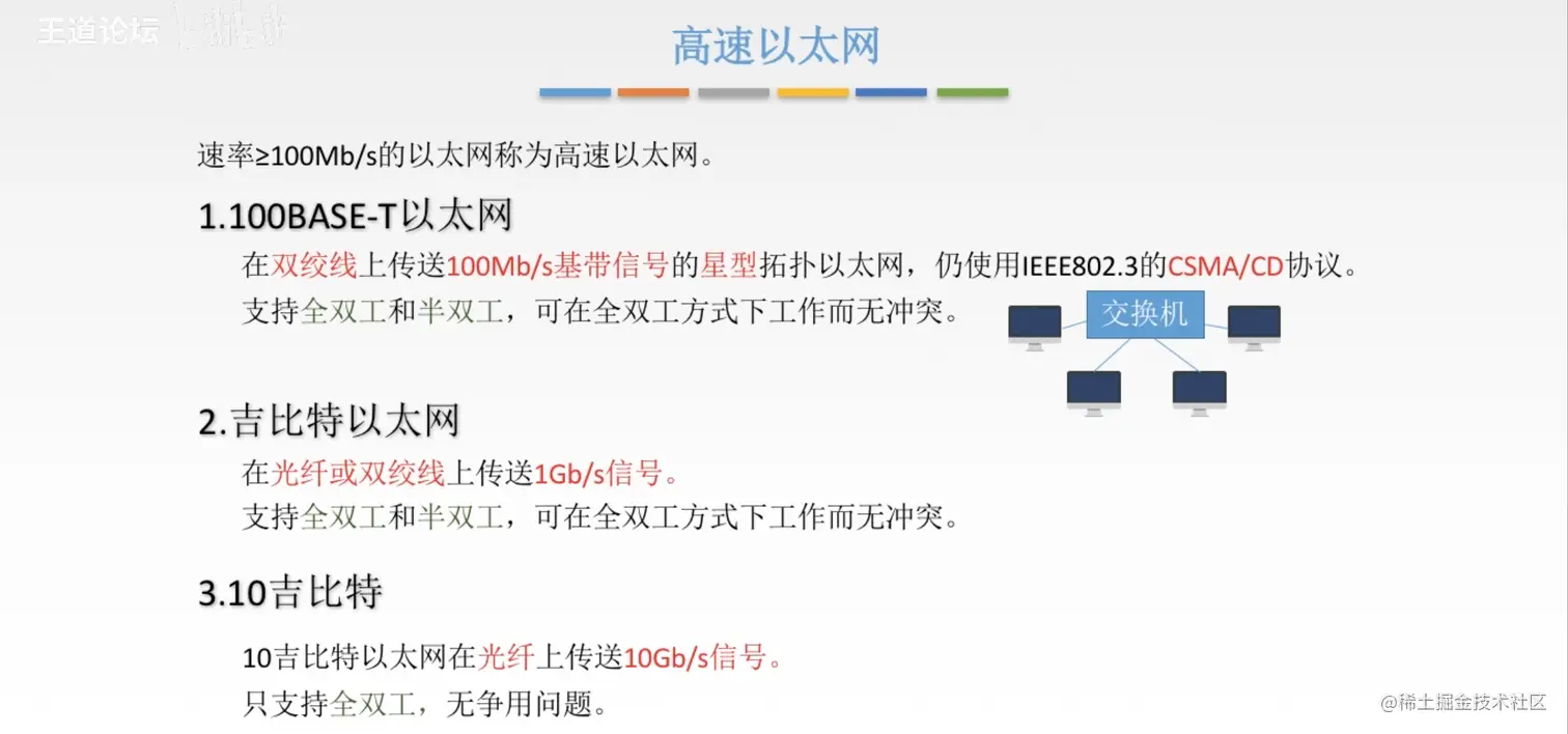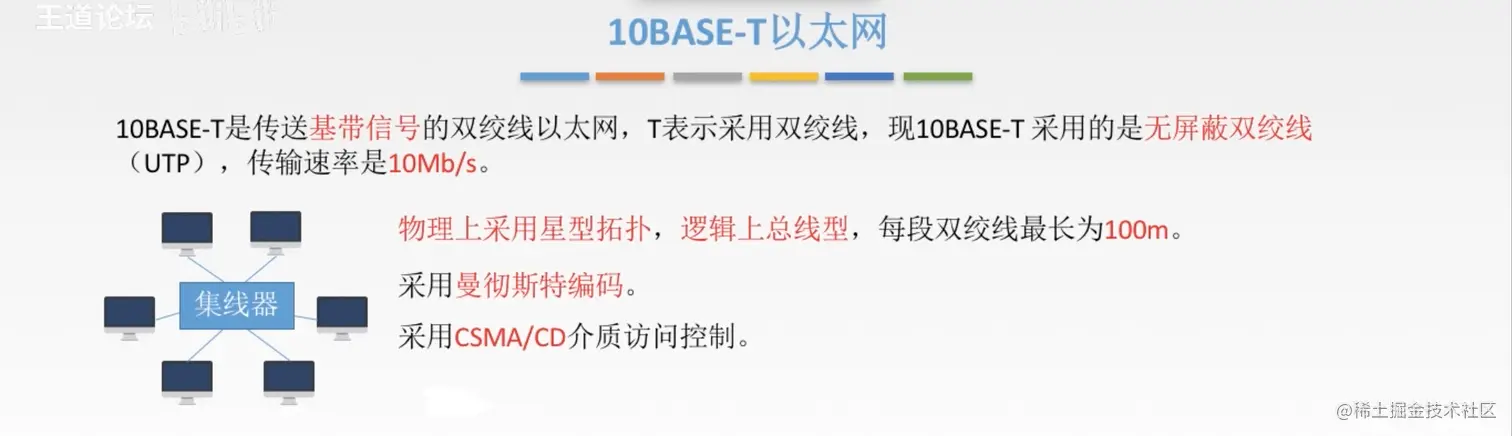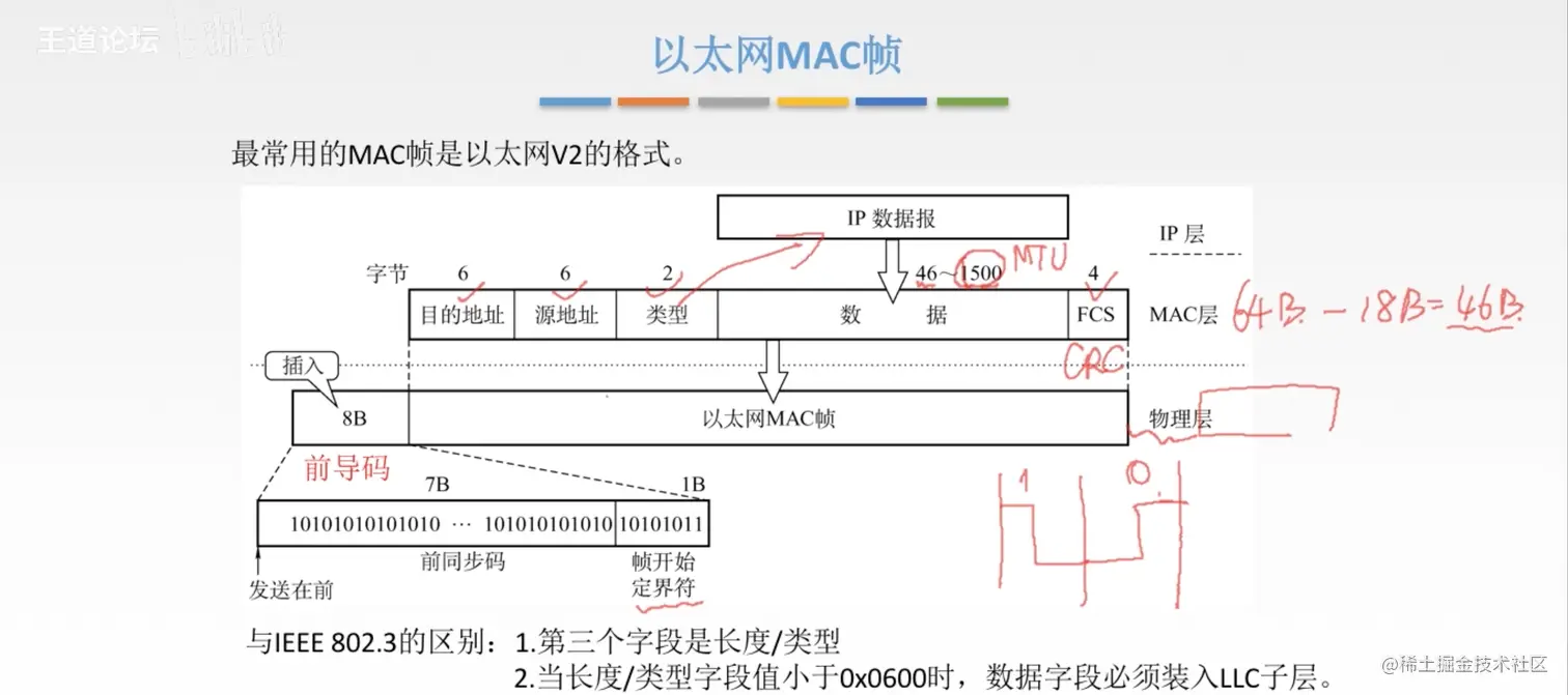 - 问题:为啥开头会有前导码,结尾却没有结束码?因为采用曼彻斯特编码,每个比特内有两个码元,发送数据的时候可以明显感受到数据的变化,但是不发送数据的时候,电压无变化