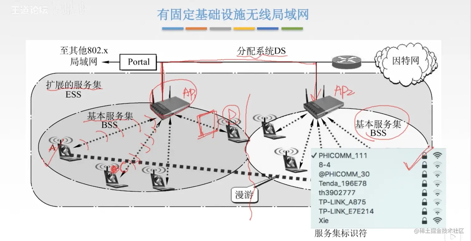 - 客户机和基站之间进行通信是采用无线的形式,基站之间借助分配系统使用有线的方式进行通信