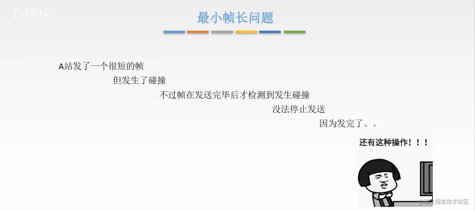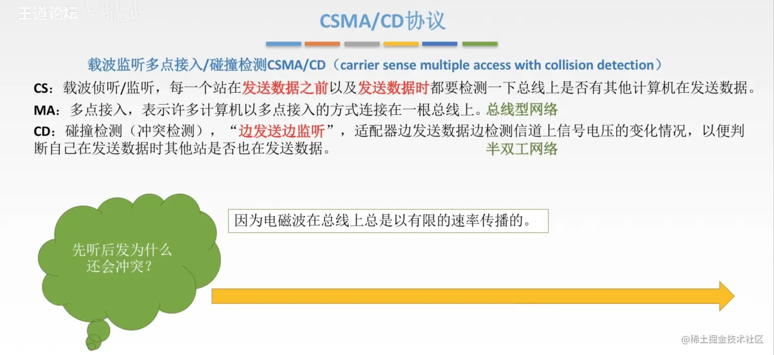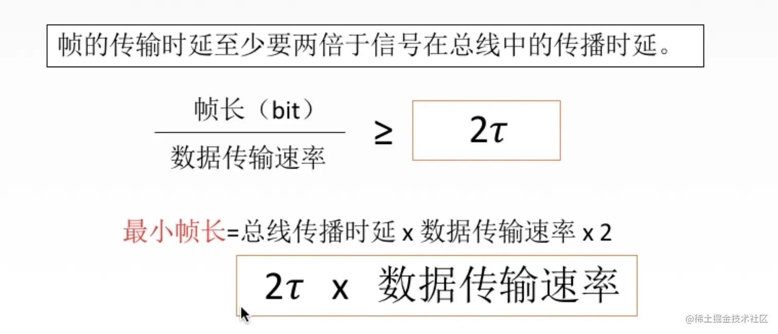 王道 计算机网络 CSMA/CD协议 草莓味的棉花糖 2021-07-11 316 阅读1分钟 检测使用过检测信道上电压的变化进行传输数据的检测 最小帧长 帧的传输时延至少要两倍于信号在总线中传播时延 以太网规定最小的数据帧需要是64B,凡是长度小于64B都是由于冲突而异常终止的无效数据帧