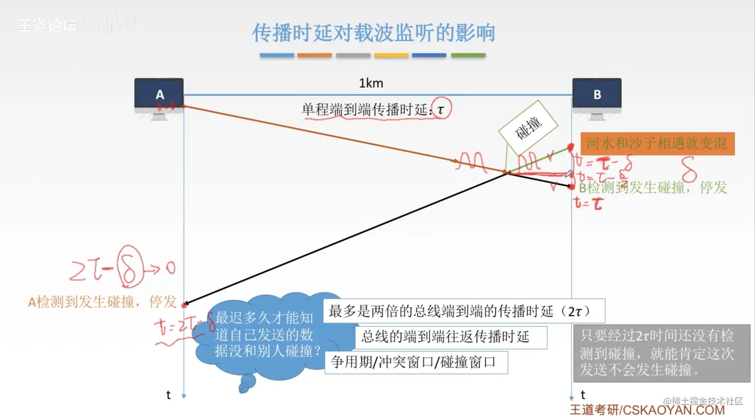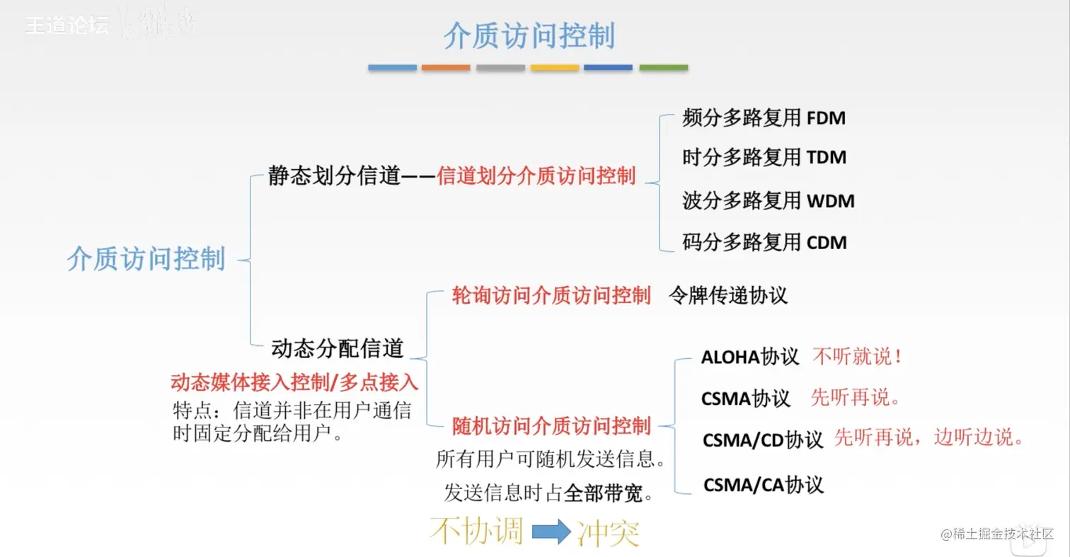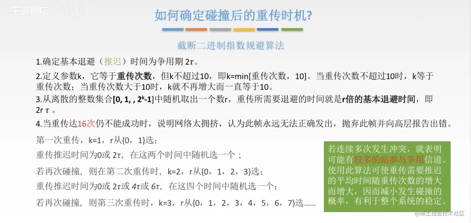 王道 计算机网络 CSMA/CD协议 草莓味的棉花糖 2021-07-11 316 阅读1分钟 检测使用过检测信道上电压的变化进行传输数据的检测 最小帧长 帧的传输时延至少要两倍于信号在总线中传播时延 以太网规定最小的数据帧需要是64B,凡是长度小于64B都是由于冲突而异常终止的无效数据帧