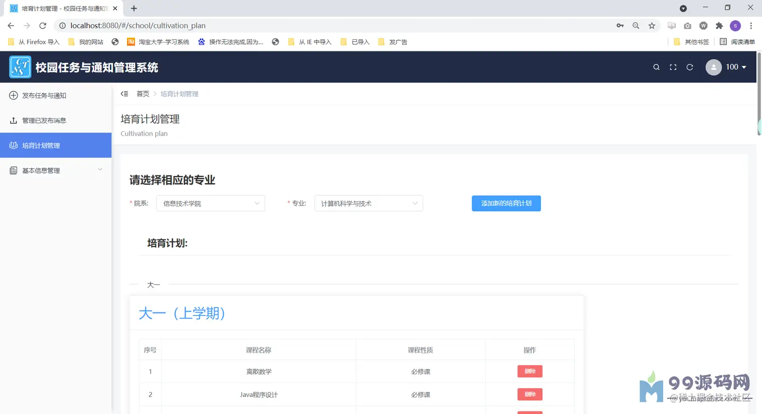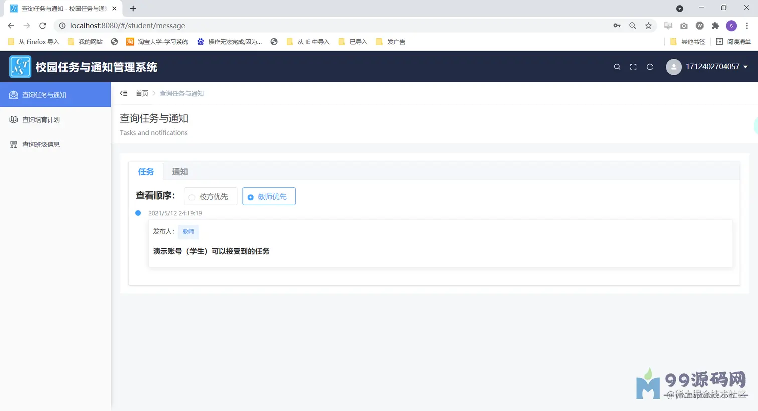 (3)学生可以接受对应于自己的任务与通知数据,对应教师发布的任务还需要上传任务结果文件才 能完成任务,并且学生还可以查询自己专业的培育计划。