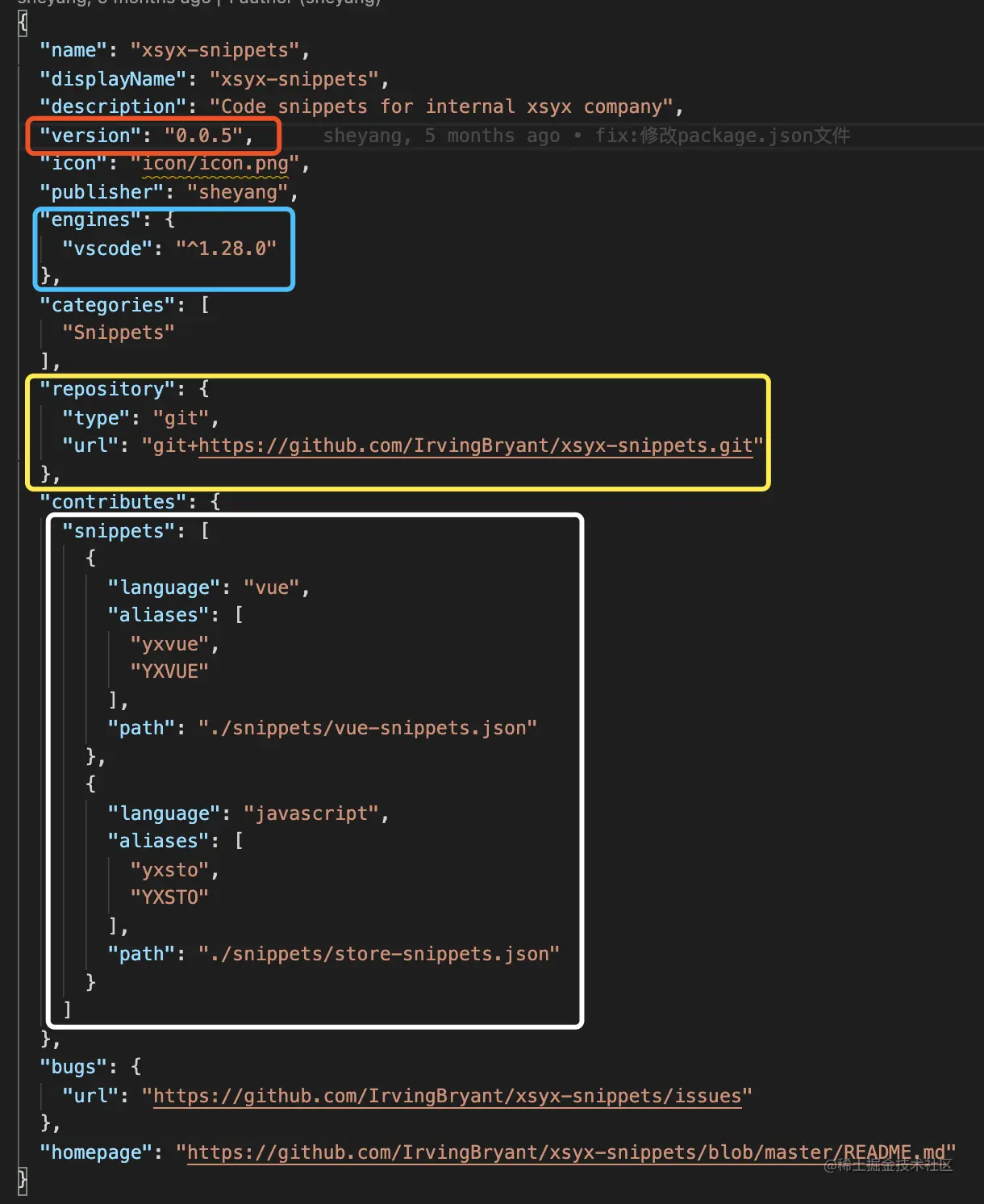- engines(蓝色区域):最低vscode版本号支持,就是vscode1.28.0版本以上的才能使用此拓展