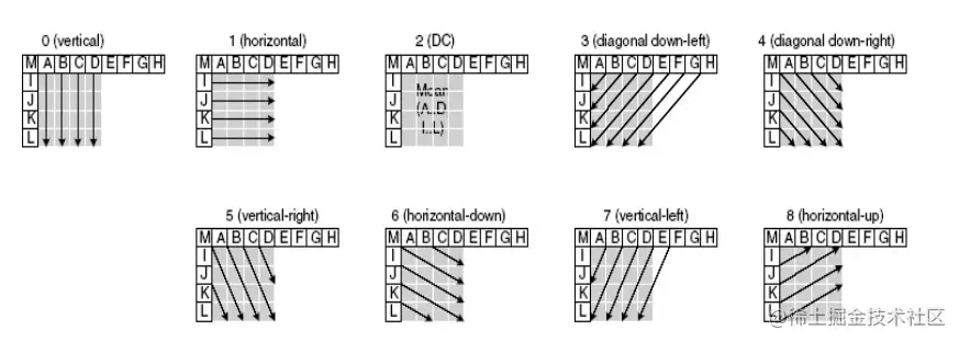 一幅图像被划分好宏块后,对每个宏块可以进行 9 种模式的预测。找出与原图最接近的一种预测模式。然后,将原始图像与帧内预测后的图像相减得残差值。再将我们之前得到的预测模式信息一起保存起来,这样我们就可以在解码时恢复原图了。