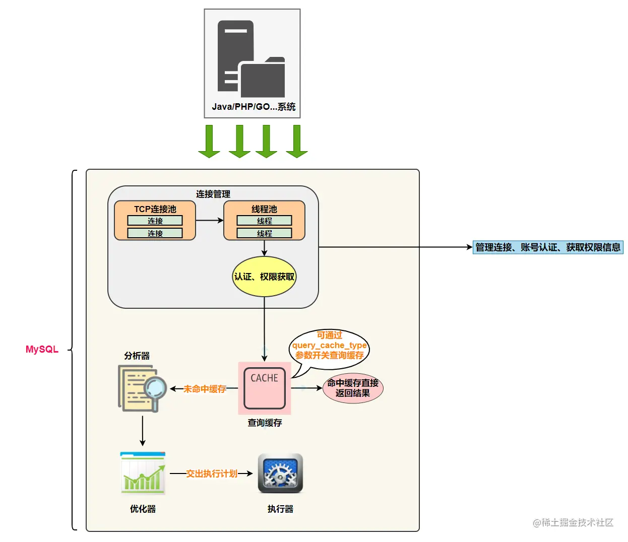 其中连接管理与解析与优化处于MySQL架构中的Server层。