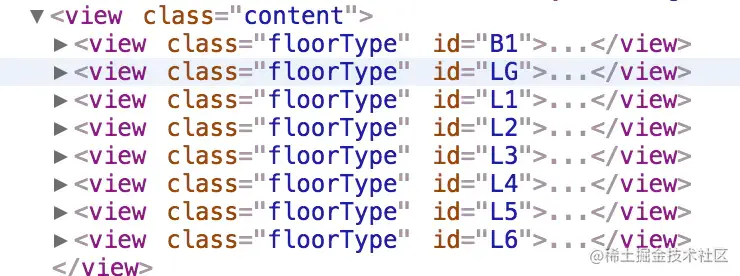 这里autoHeight是根据不同机型的高度动态计算出来的,scroll-view有个重要属性:scroll-into-view,它接收一个string值,即为滚动的地点(锚点),那么我们需要在scroll-view子节点也设置相应的锚点列表:如上图的class=floorType节点中的id属性。这样我们的滚动就有了一一对应的关系了,在筛选块点击楼层,将toView变量设置成对应的数据,列表也会滚动到对应的位置。