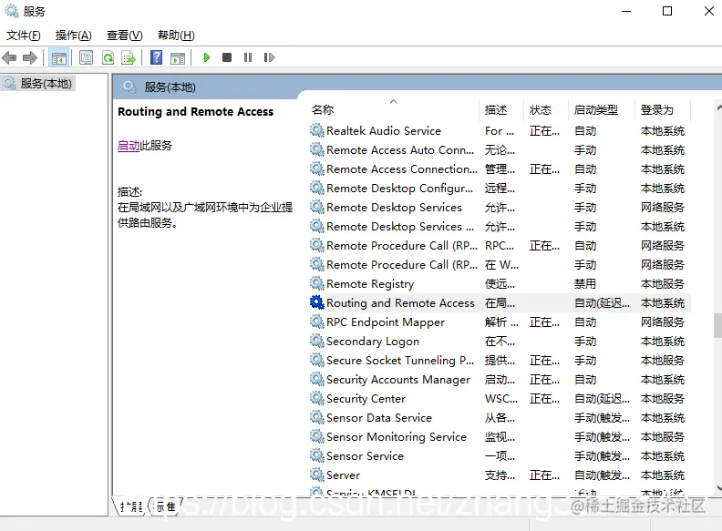 5. 再检查 Routing and Remote Access 服务,如果没有启动,将它启动