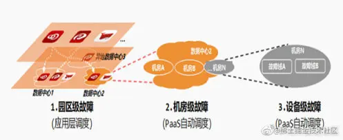 1)云平台支持多层次故障保护机制,确保同一业务的不同实例会均衡分发到两地三中心的不同资源域,确保单个存储、单个集群甚至单个数据中心发生故障时,不会影响业务的整体可用性。