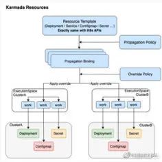 2)Karmada-Controller-Manager 管理包括 cluster、policy、binding、works 等多种 CRD 资源作为管理端资源对象,但是它没有侵入到原生的我们想要部署的那些 k8s 原生资源对象。