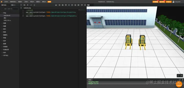 在 ThingJS 中可通过 app.camera.porjectionType 设置摄像机的投影类型,参考脚本如下: