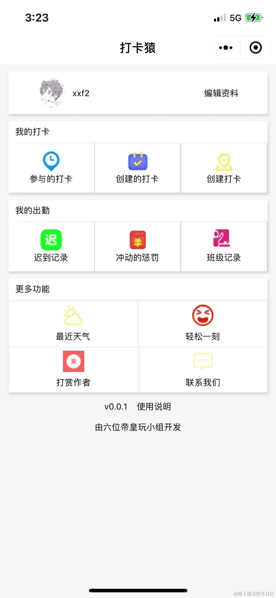 本项目为创建打卡猿微信小程序。项目共写了11个模块:编辑资料、参与的打卡、创建的打卡、创建打卡、迟到记录、冲动的惩罚、班级记录、最近的天气、轻松一刻、打赏作者和联系我们模块。