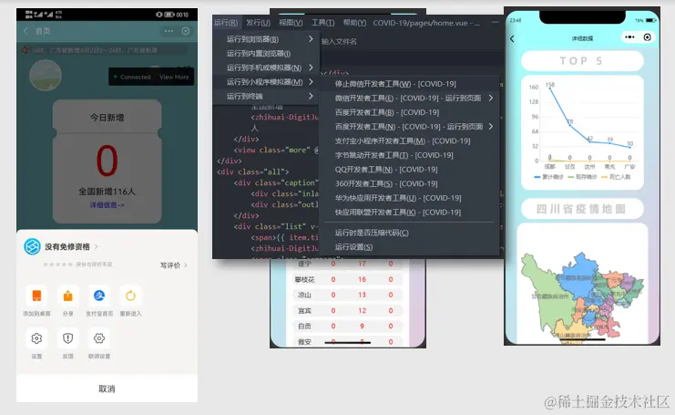 使用Uni-app,一份代码多端部署,不仅可生成微信小程序、还可生成支付宝小程序、华为快应用等。可将将本省确诊前5的城市以及数据通过折线图进行呈现。
