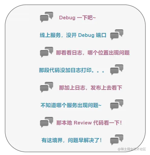 微服务的关键在于拆分服务,但是关键不在 微 ,而在于合适的大小。当我们跨出拆分服务的那一刻起,我们就得对我们拆分后的服务负责,这个是一个程序员应有的担当!当服务出现问题的时候,你是否还苦于排查,而无从定位。线上的代码我们无法 debug,找出问题的时刻往往出现以下对话: