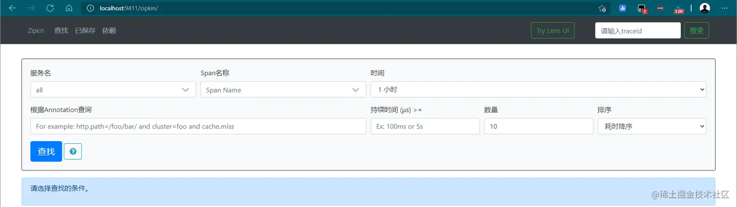 成功启动后通过访问 http://localhost:9411 可以看到以下页面: