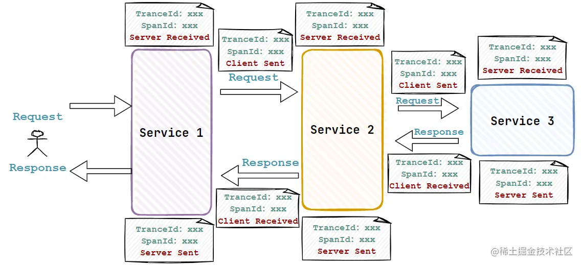 代表了一组基本的工作单元。为了统计各处理单元的延迟,当请求到达各个服务组件的时候,也通过一个唯一标识(SpanId)来标记它的开始,具体过程和结束。通过 SpanId 的开始和结束时间戳,就能统计该 Span 的调用时间,除此之外,我们还可以获取如事件的名称,请求信息等元数据