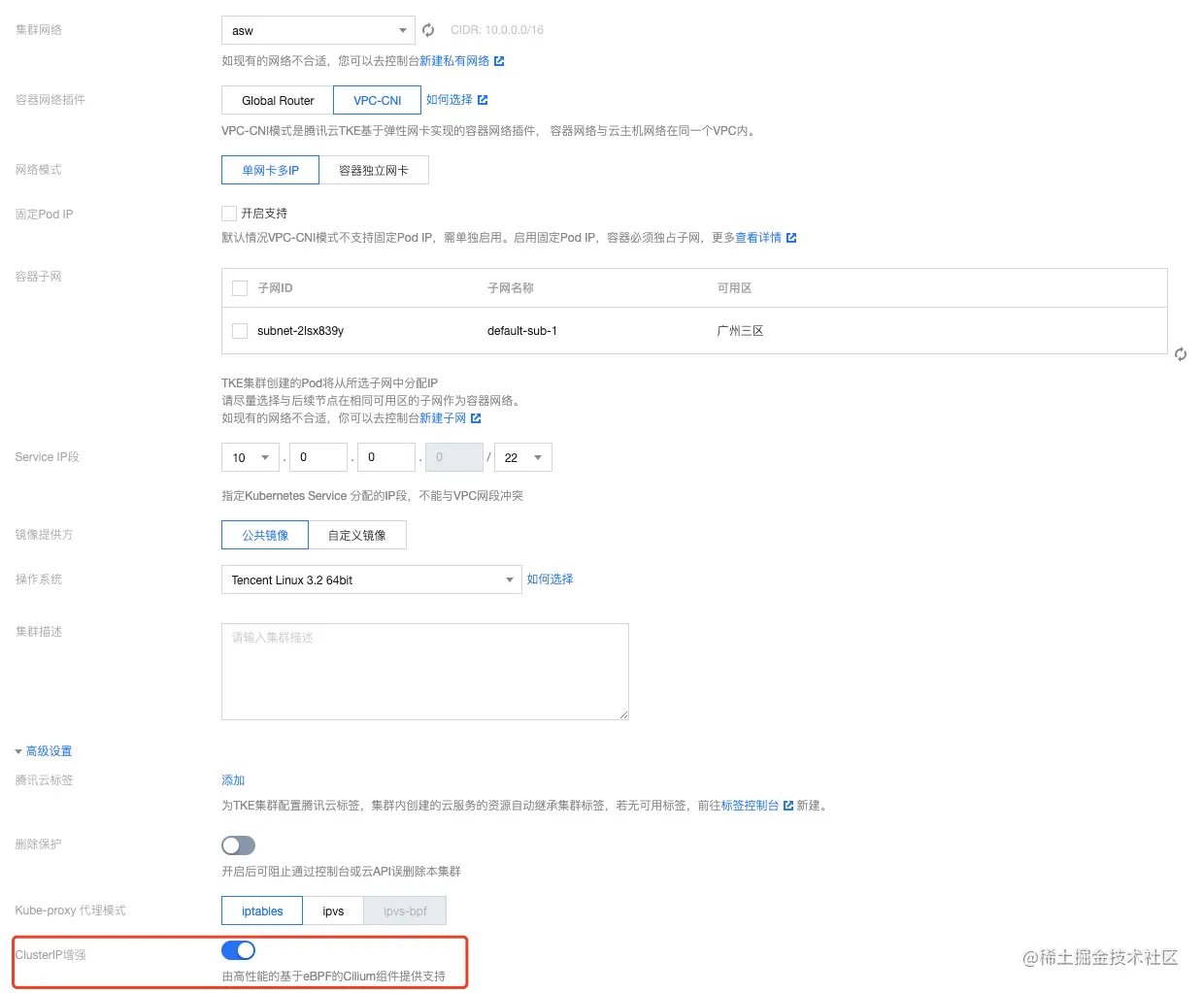 申请 Cilium 支持 ClusterIP 产品化内测开通后,创建 TKE 集群时高级设置中打开 ClusterIP 增强 即可: