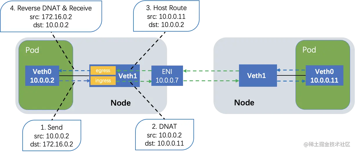 TKE 由此对 Cilium 加以改造,使其支持了除原生支持的 veth 和 ipvlan l3 的第三种数据面方案,如图(假设 pod 访问 Service IP 为 172.16.0.2),数据面上,将原本挂载到节点侧的 veth 上的 bpf 程序,挂载到 pod 内的独立网卡(同时也是弹性网卡)上,使得 Pod 的网络报文在发出的时候做 DNAT(目的地址转换),而回报文在网卡接收的时候做反向 DNAT,从而支持 ClusterIP 的访问。该数据面方案可作为一个通用方案适配 Ipvlan l2、SRIOV 等数据面场景。