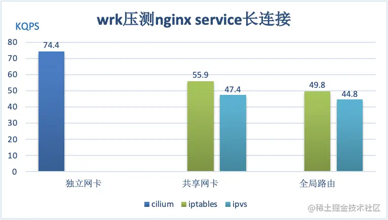 测试数据表明,基于 Cilium 的独立网卡 ClusterIP 访问方案性能最好。在短连接场景下,其 QPS 相比共享网卡的 iptables 和 ipvs 方案提升48%和74%,相比全局路由的 iptables 和 ipvs 方案提升了62%和91%。在长连接场景下,其 QPS 相比共享网卡的 iptables 和 ipvs 方案提升了33%和57%,而相比全局路由的 iptables 和 ipvs 方案提升了49%和66%。iptables 的性能较 ipvs 性能较好是因为测试环境中 Service 数量还不够多,ipvs 的优势在于大量 Service 的场景。
