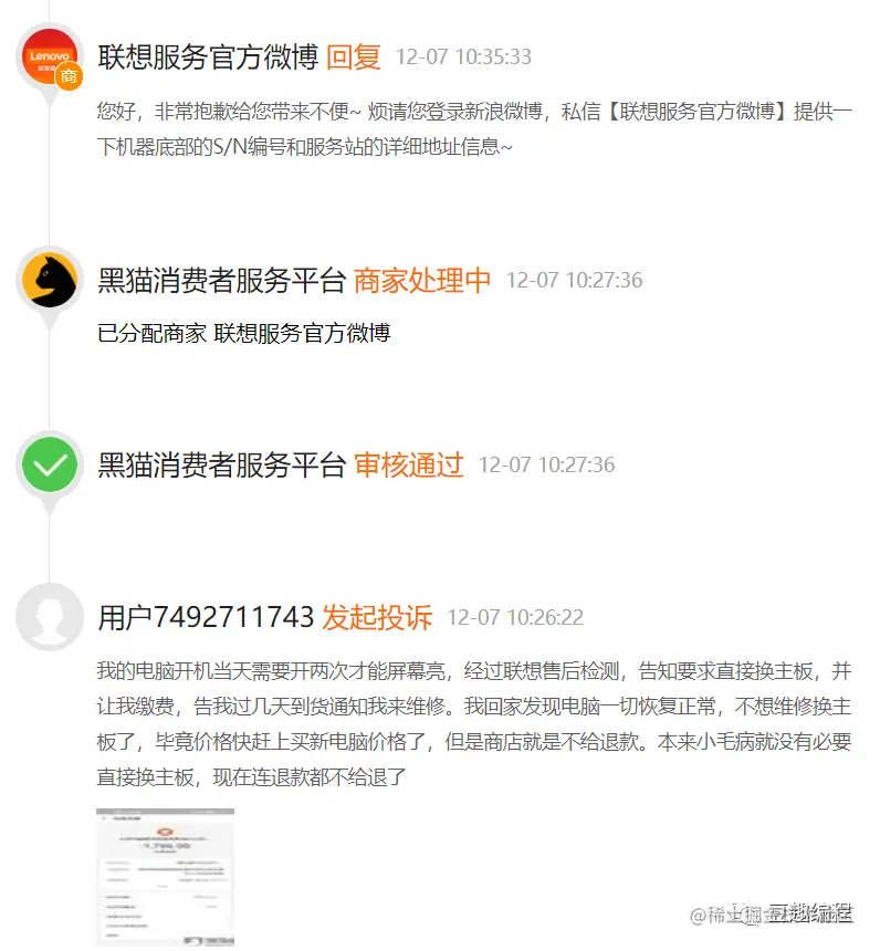 看来这次联想总部是和站长联合起来了,明显是站长说服了客服不给我处理。 总之不管他们是不是真的有这条规矩,我是坚持认为因误判,夸大问题而诱导我下单的事实是不能容忍的,总部客服出尔反尔的处理方式我更不能接受。 但是连总部都不管,还能找谁呢。就像以前投诉圆通快递丢件不赔,每次打电话给总部客服只是说将问题记录,结果并没有人给我处理,最后只能找更高部门:邮管局。