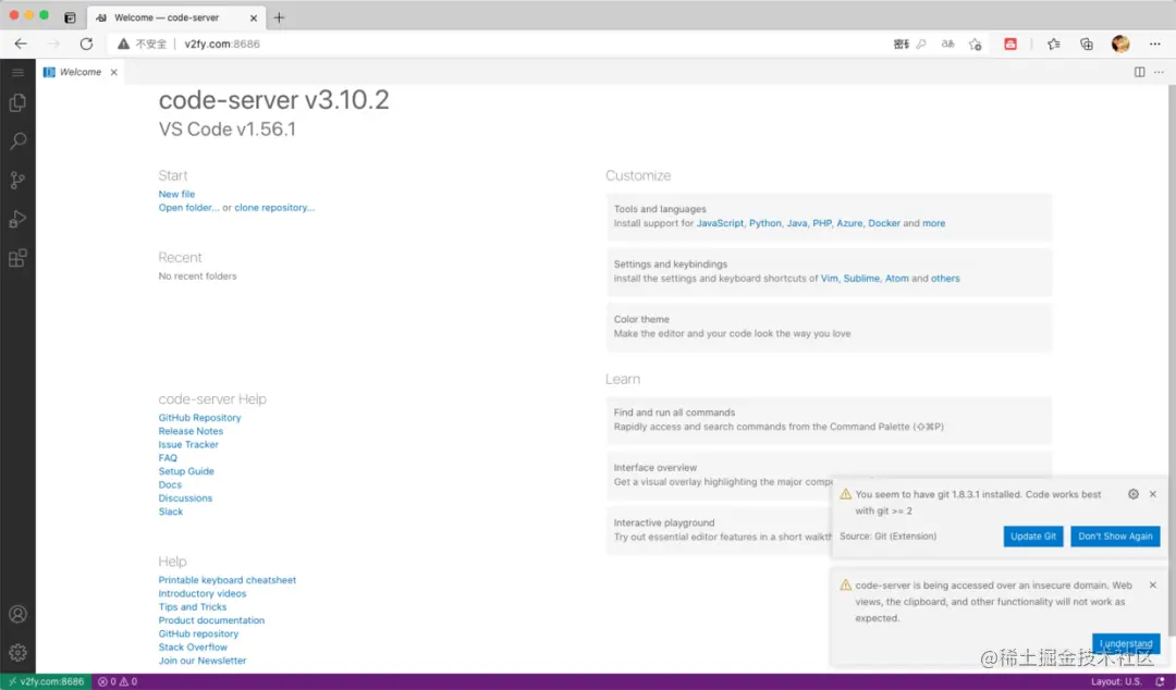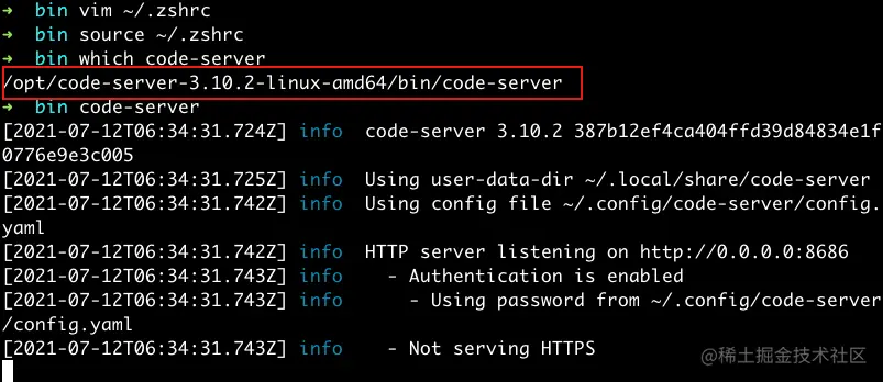 我们只需将 /opt/code-server-3.10.2-linux-amd64/bin 添加到PATH变量即可, 如果你使用bash,则在.bashrc中填写以下代码, 如果你使用zsh, 则在.zshrc中添加以下代码