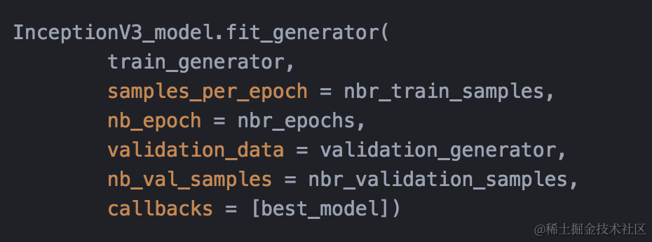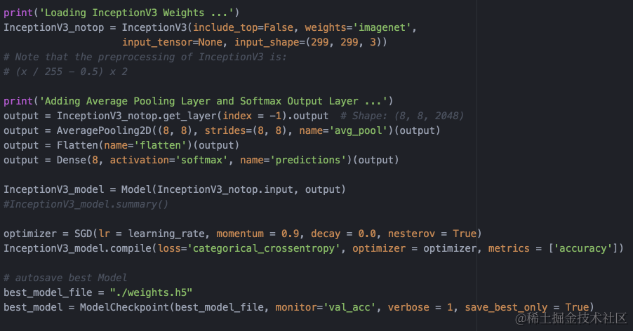 - ü 构建Inception_V3深度卷及网络,使用在ImageNet大规模图片数据集上已经训练好的参数作为初始化,定义回调函数保存训练中在验证集合上最好的模型——图5;