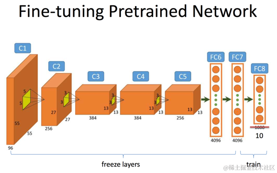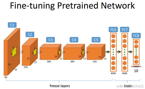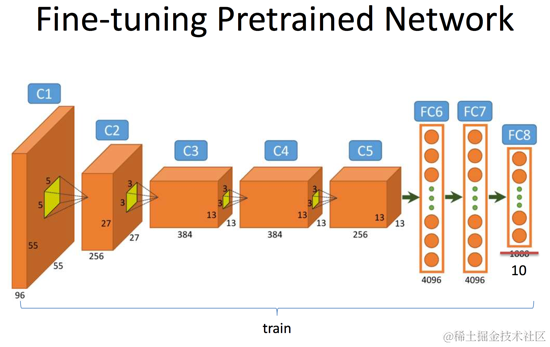 - (1)我们首先微调最后一层Softmax分类器,假设原来的网络是用来分类1000类物体的(例如ImageNet的目标),而现在我们的数据只有10个类别标签,因此我们最后一层输出层(FC8)的神经元个数变为10。我们使用很小的学习率来学习层FC7与FC8之间的权重矩阵而固定这之前所有层的权重;