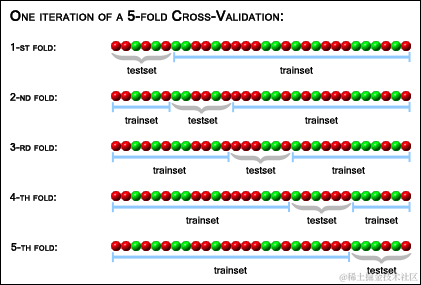 还记得我们之前说到要把三千多张图片分为训练集和验证集吗?这种划分其实有很多种。一种常见的划分是打乱图片的顺序,把所有的图片平均分为K份,那么我们就可以有K种<训练集,验证集>的组合,即每次取1份作为验证集,剩余的K-1份作为训练集。因此,我们总共可以训练K个模型,那么对于每张测试图片,我们就可以把它送入K个模型中去预测,最后选投票数最高的类别作为预测的最终结果。我们把这种方式成为“K折交叉验证”(K-Fold Cross-Validation)。图9表示的就是一种5折交叉验证的数据划分方式。