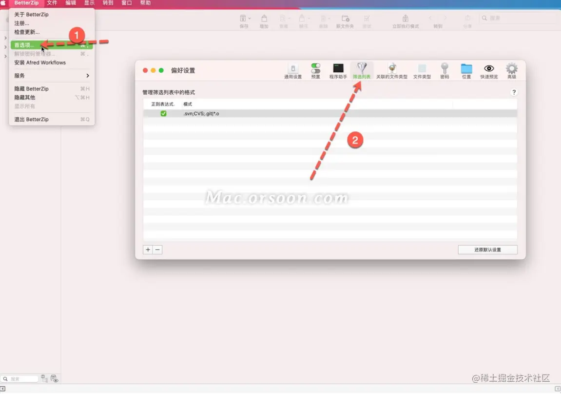 第二步,我们点击“BetterZip”-“首选项”,进入到“偏好设置”界面。