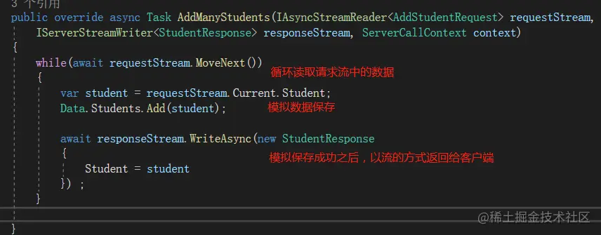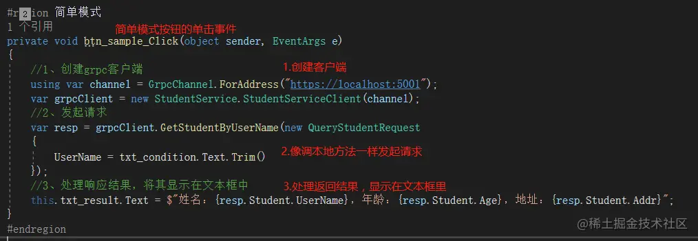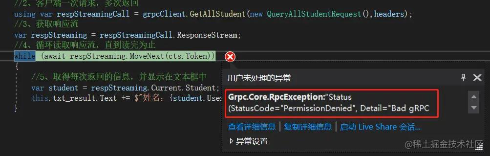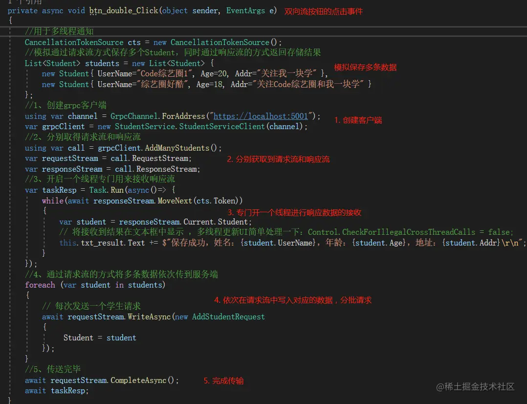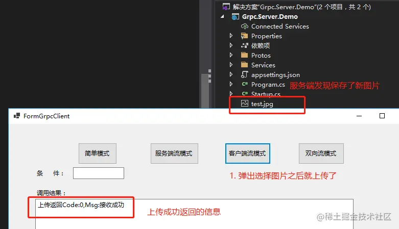 private async void btn_client_Click(object sender, EventArgs e) { // 用于存放选择的文件路径 string filePath = string.Empty; // 打开文件选择对话框 if (this.openFileDialog1.ShowDialog() == DialogResult.OK) { filePath = this.openFileDialog1.FileName; } if(string.IsNullOrEmpty(filePath)) { this.txt_result.Text = "请选择文件"; return; } //1、创建grpc客户端 using var channel = GrpcChannel.ForAddress("https://localhost:5001"); var grpcClient = new StudentService.StudentServiceClient(channel); //2、读取选择的文件 FileStream fileStream = File.OpenRead(filePath); //3、通过客户端请求流将文件流发送的服务端 using var call = grpcClient.UploadImg(); var clientStream = call.RequestStream; //4、循环发送,指定发送完文件 while(true) { // 一次最多发送1024字节 byte[] buffer = new byte[1024]; int nRead = await fileStream.ReadAsync(buffer, 0, buffer.Length); // 直到读不到数据为止,即文件已经发送完成,即退出发送 if(nRead==0) { break; } // 5、将每次读取到的文件流通过客户端流发送到服务端 await clientStream.WriteAsync(new UploadImgRequest { Data = ByteString.CopyFrom(buffer) }); } // 6、发送完成之后,告诉服务端发送完成 await clientStream.CompleteAsync(); // 7、接收返回结果,并显示在文本框中 var res = await call.ResponseAsync; this.txt_result.Text = $"上传返回Code:{res.Code},Msg:{res.Msg}"; } -