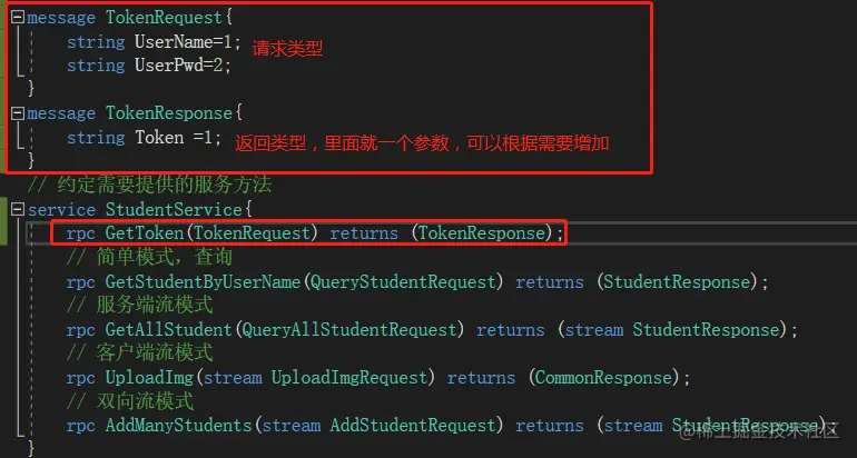 现在student.proto文件中增加获取Token的相关约定,编译自动生成对应代码,如下: