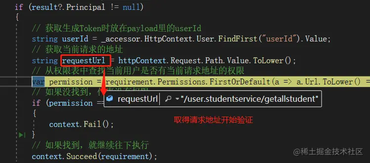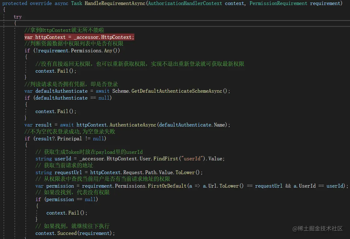 增加一个PermissionHandler.cs文件,集成自AuthorizationHandler,然后重写处理方法,核心代码如下: