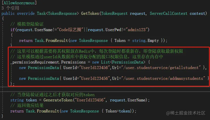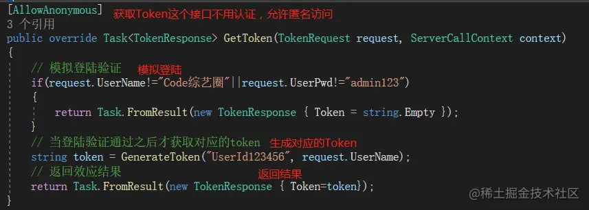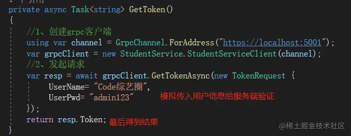 通过调用结果得知,现在提供的gRPC服务已经受到保护,需要持有对应身份的请求才能访问,所以接下来就需要服务端提供一个获取身份Token的方法。