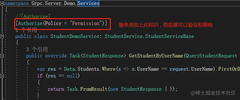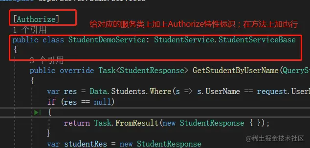 在服务上增加Authorize特性标识